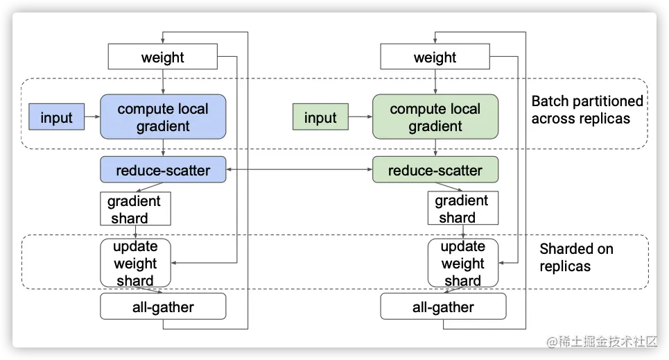 如下图所示,我们可以使用reduce scatter生成每个副本分片的求和梯度,就是图中的 gradient shard,这样每个副本都可以在分片上执行权重更新。之后,我们可以使用all gather向所有副本广播更新的权重分片。“reduce-scatter”和“all-gather”的组合应该具有与原始“all-reduce”类似的性能。但是因为每个副本会自己更新权重分片(update weight shard),所以总的耗时会降低,这样就相当于总的权重更新被各个副本均匀分担了。