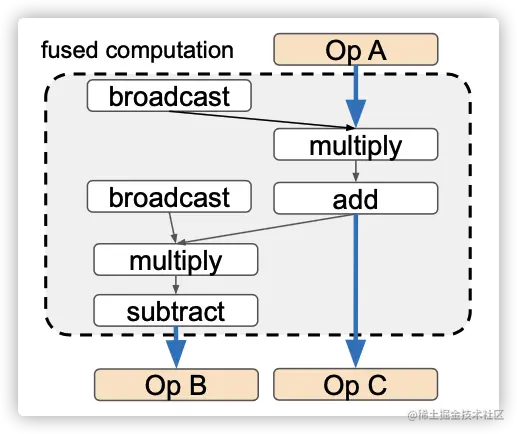 图1:具有元素级别操作(element-wise)的融合操作。蓝色粗箭头表示从全局存储器到全局存储器的数据传输,所有中间结果都存储在本地存储器中。