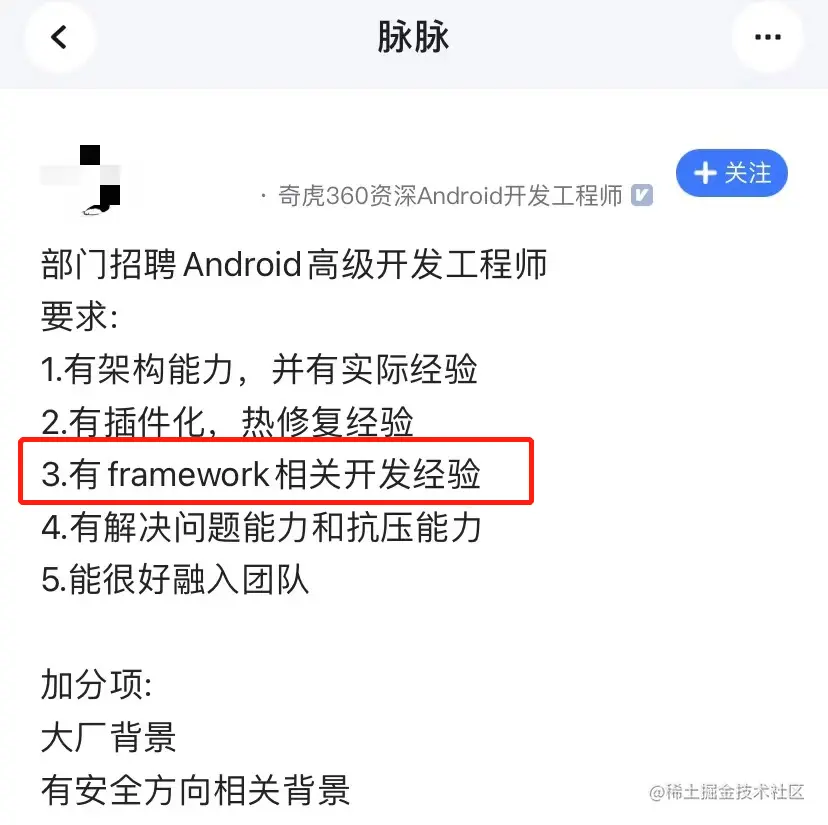 Android Framework 开发虽然比较偏底层,圈子窄,但是能掌握一些原理的东西,可以触类旁通,往应用层发展也可以,接下来我们看看Framework知识有多重要。举几个栗子,你或许就能清楚了。