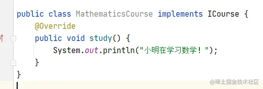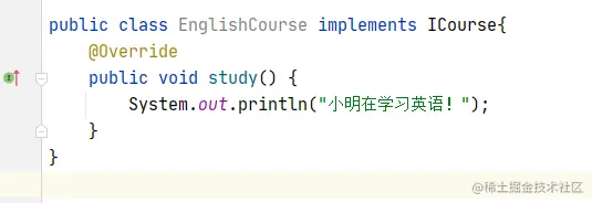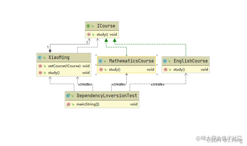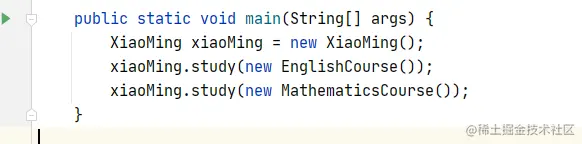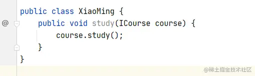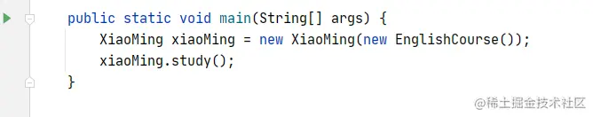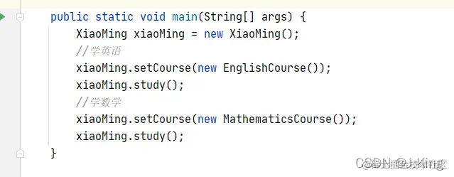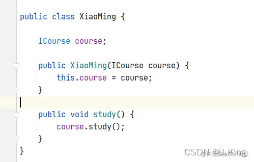 我们这时候再看来代码,小明不管还要学习哪些新的课程,对于新的课程,我只需要新建一个 类,通过传参的方式告诉 XiaoMIng,而不需要修改底层代码。实际上这是一种大家非常熟悉的方式, 叫依赖注入,注入的方式还有构造器方式和 setter 方式。我们来看构造器注入方式: