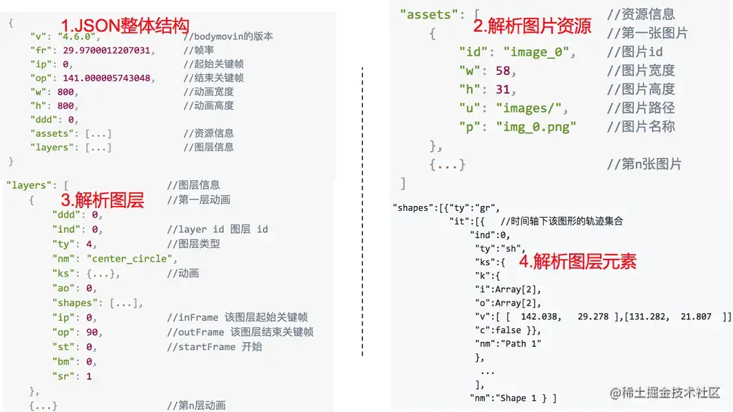 结构层:可以读取到动画画布的宽高,帧数,背景色,时间,起始关键帧,结束帧等信息。asset:图片资源信息集合,这里放置的是 制作动画时引用的图片资源。layers:图层集合,这里可以获取到多少图层,每个图层的开始帧 结束帧等。shapes:元素集合,可以获取到每个图层都包含多个动画元素。