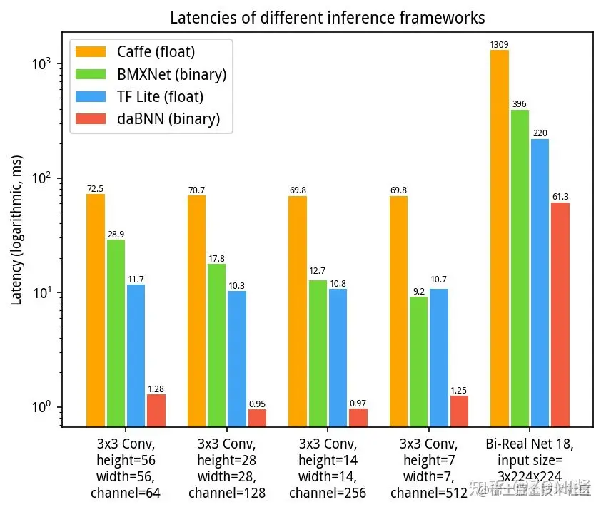 Dabnn 2019[4]由京东AI研究院推出,基于汇编调优后的BNN推理工具。它有效提升了BNN在ARM框架端上的推理速度,但是这个工具并不能用于模型训练,需要使用其它工具进行训练。