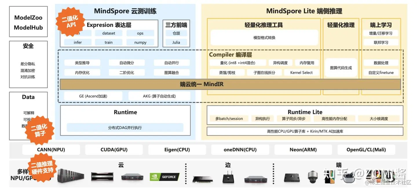 下面来看看BNN在AI系统全栈/AI框架中的一个位置,橙色标签的地方是BNN所在的位置。从图中可以知道,在表达层API需要提供二值化网络模型使用到的API接口;接着在中间边一层和runtime其实没有太多的区别,最主要是底层需要提供二值化相关的算子或者是二值化推理的专用硬件电路。