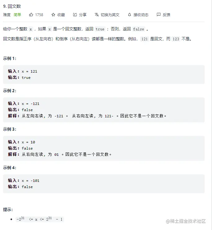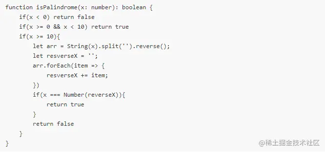 回文数 陈理性呀 2022-01-14 147 阅读1分钟 回文数:简单难度 最普通的方式: 小于0的负数,一定不是回文数,直接返回false 0-9的个位数,因为只有一位,正反都是一样的,直接返回true 两位数及以上 整数转化为字符串 将字符串数字切割成字符串数组,调用数组的倒序方法 遍历数组拼接字符串