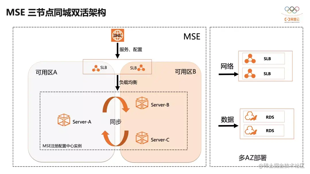 如图,微服务引擎 MSE 的同城双活三节点的架构,经过精简的上下游依赖,每一个都保证高可用架构。多节点的 MSE 实例,通过底层的调度能力,会自动分配到不同的可用区上,组成多副本集群。