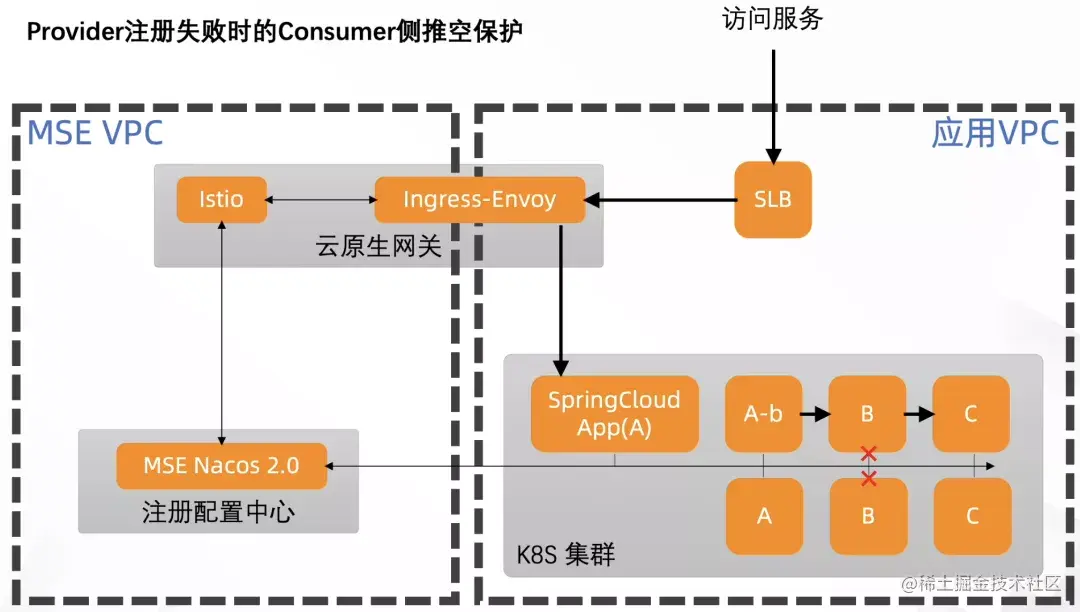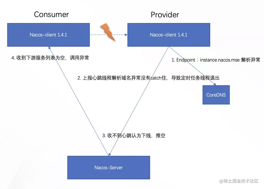 - 注册中心的正常机制是,心跳不续约,30 秒后自动下线。由于 CoreDNS 影响的是整个 K8s 集群的 DNS 解析,所以 Provider 的所有实例都遇到相同的问题,整个服务所有实例都被下线;