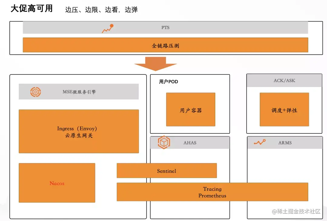 如图,阿里巴巴大促高可用体系,不断做压测演练、验证系统健壮性和弹性、观测追踪系统问题、验证限流、降级等预案的可执行性。