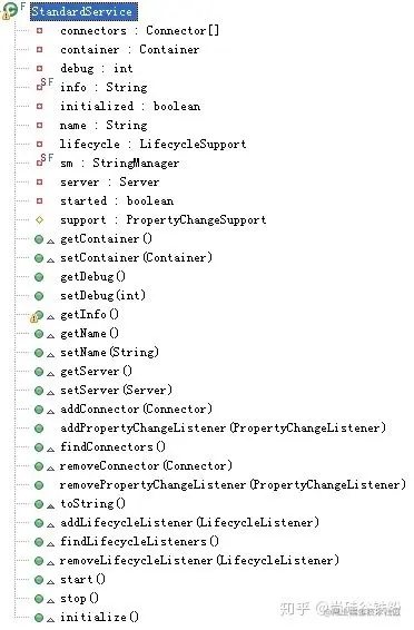 Tomcat 中 Service 接口的标准实现类是 StandardService 它不仅实现了 Service 借口同时还实现了 Lifecycle 接口,这样它就可以控制它下面的组件的生命周期了。StandardService 类结构图如下: