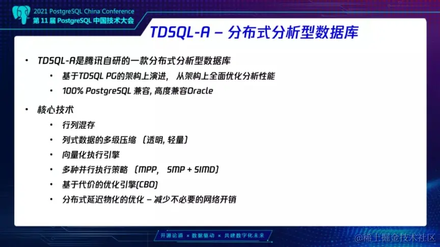 接下来要介绍的是我们的分析型产品 TDSQL-A,TDSQL-A 是基于 TDSQL PG 版架构上全面优化来打造关于分析性能 AP 方面的数据库。TDSQL-A 定位是希望能够提供海量数据实时分析,所谓海量数据是指 10PB 以上秒级分析查询功能,同时 TDSQL-A 也 100%兼容 PG,也高度兼容 Oracle,兼容性在特定场景下达到 98%。