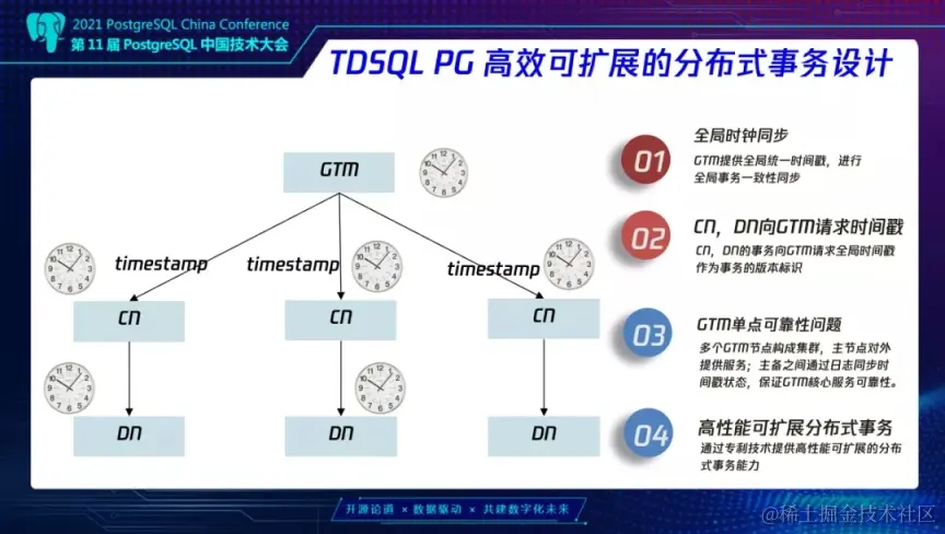 分布式事务系统里的一个核心设计难题就是如何高性能,低成本的保障事务的一致性。针对这个问题,我们 TDSQL PG 版也发明了一套基于 Global TimeStamp (全局时间戳)的 MVCC 可见性判断协议来提供高性能可扩展的分布式事务能力。这种协议下 GTM 只需要去分配全局的 GTS,CN,DN 节点上的事务会向 GTM 请求 GTS 来作为事务的版本标识。这样就可以把提交协议从 GTM 的单点瓶颈下放到每一个节点上,减轻压力。同时多个 GTM 节点构成集群,主节点对外提供服务,主备之间通过日志同步时间戳状态, 保障了 GTM 服务的高可靠性。