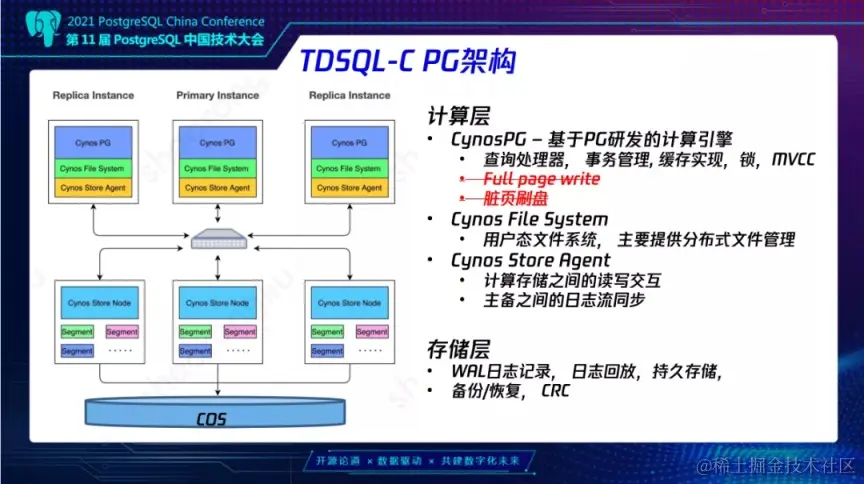 下面来讲一下云原生数据库 PG 架构,左边这个图大概可以分为两个部分,上面是计算层,下面是存储层。 计算层大概分为三个部分,首先是 CynosPG,CynosPG 是基于 PG 研发的计算引擎,它提供通常计算引擎的功能,查询处理器、事务管理、缓存实现等等。因为计算层并不存储数据,而且我们只是把日志存储在存储上面,所以也就省去了不必要的,比如说 Full page write、脏页刷盘。计算层中间一层是用户态文件系统 Cynos File System,它主要是提供了分布式文件管理。最下面一层是 Cynos Store Agent,它提供了计算存储之间的读写交互,以及主备之间日志流的同步。