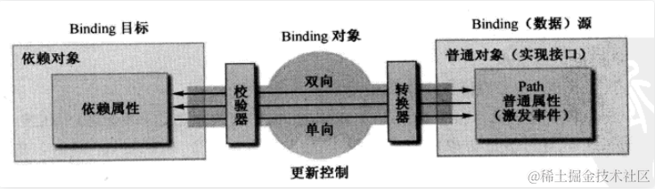 从Binding模型中可以看出,Binding对象作为目标和源之间的桥梁,除了著名的双向绑定特征外,WPF还在Binding中添加了一些机制方便我们更加方便的处理数据,比如校验器和转换器。
