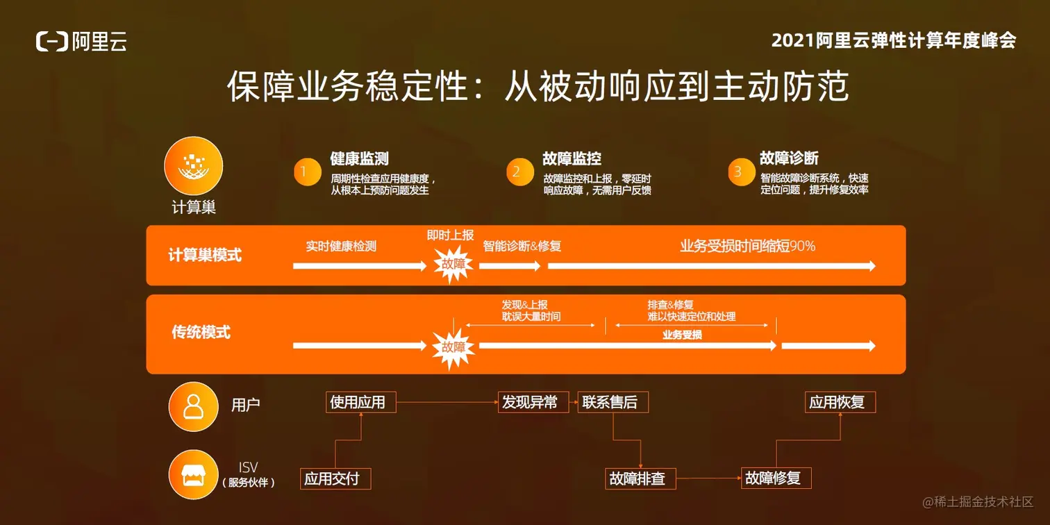 接入计算巢之后,其底层是统一的阿里云平台,阿里云可以在获得用户授权的情况下,把基础设施层面的数据监控的信息和其他的业务信息,同步提供给合作伙伴,使得合作伙伴可以在事前、事中、事后获得立体的保障,从被动响应变成主动防范。