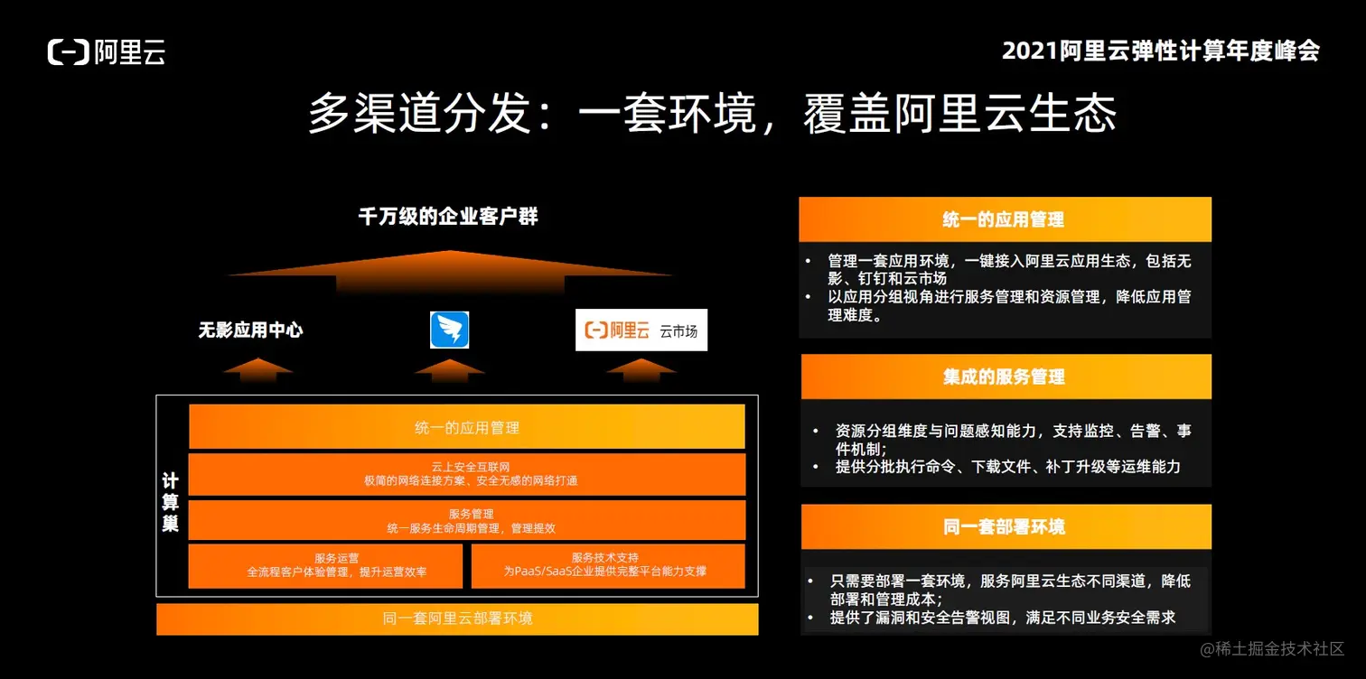 最后一点是关于计算巢的分发和如何打通多渠道。阿里云有很多企业客户,但是对于SaaS类的合作伙伴,如何去触达To B的场景,如何触达小微企业,是他们需要思考的问题。其实通过计算巢,可以让合作伙伴的产品接入到阿里云的所有生态体系,从而触达到千万级别的企业客户群。