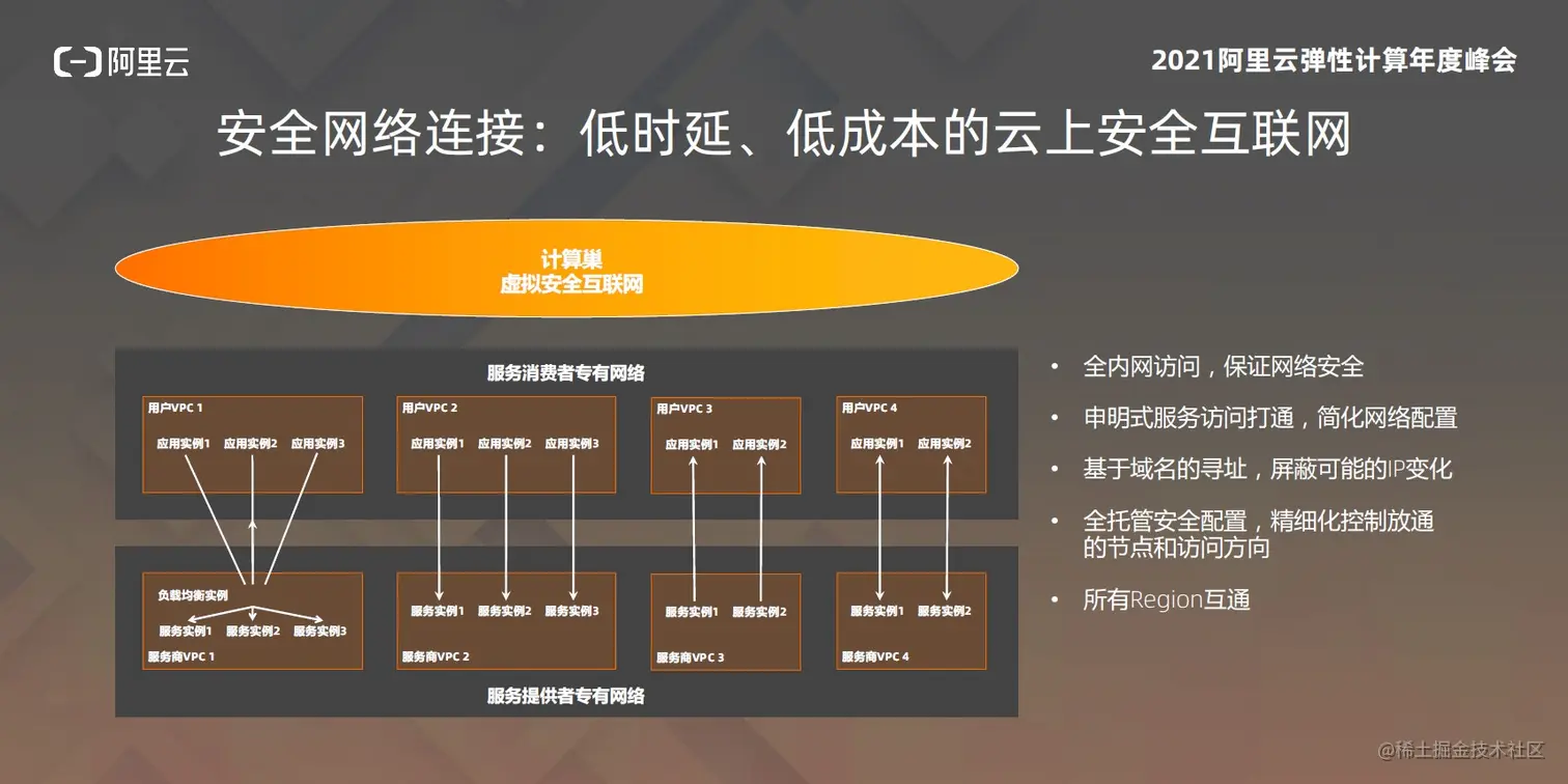 此外,不少客户在云上通过公网连接,而公网一定是有安全、时延、流量和带宽等问题。计算巢通过构建统一的大内网,帮助合作伙伴与客户构建一个安全的云上互联网。