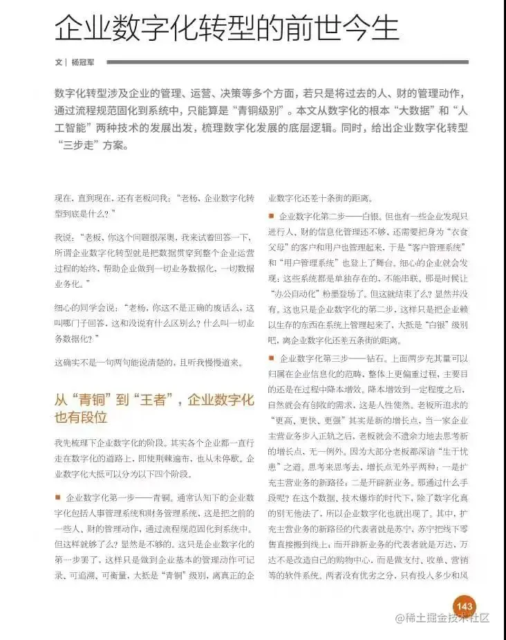 文章中,杨冠军从数字化的根本「大数据」和「人工智能」两种技术的发展出发,对数字化发展的底层逻辑进行了细致的梳理,并深入分享了企业数字化转型的「三步走」方案:数据打通与数据接入、数据处理、数据可视化。