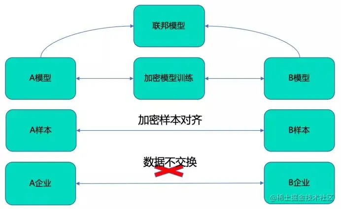 这是个特别好的问题,而且其实是属于数据接入的范畴了。数据接入的前提就是必须保障隐私及安全。这就要依赖于隐私求交、联邦学习等隐私计算的技术,来完成多方数据的联合分析、训练、建模、预测。从而实现数据价值的流通,达到数据“可用不可拥”。联邦学习是个单独的课题,此处就不赘述了,附上一张逻辑图供参考吧(如图5所示)。
