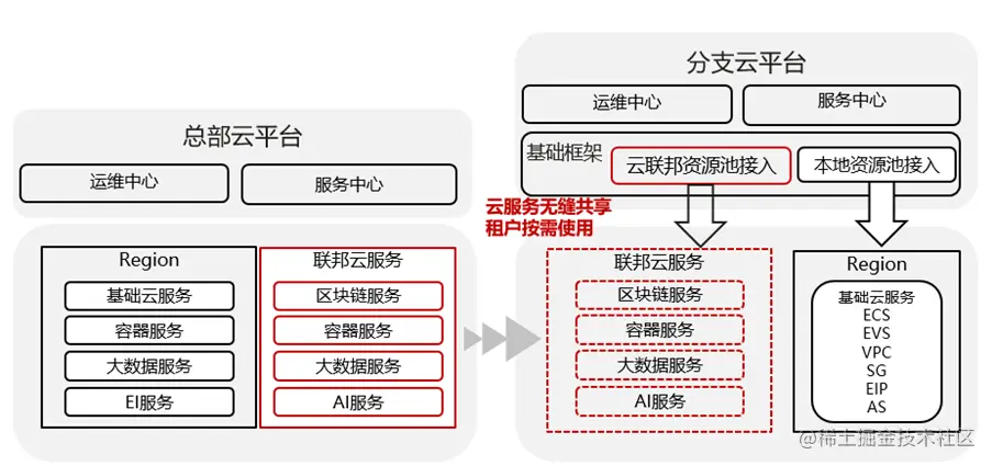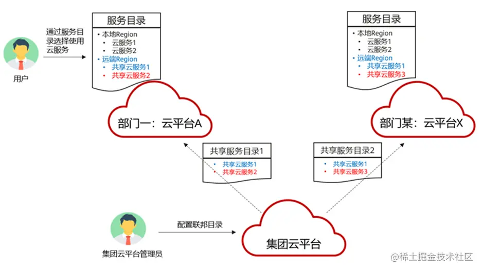 如上图所示,部门一的云平台A和部门二的云平台B建立联邦关系,云平台A的用户可以共享使用云平台B的云服务,此时云平台B的管理员可以在云平台B上建立联邦目录,允许云平台A的用户访问指定范围的云服务。云平台A通过联邦关系读取到云平台B设定的联邦目录,将其映射为云平台A的一个远端Region,这样云平台A的用户就可以像使用云平台A的本地云服务一样使用云平台B的云服务,无需关心云服务的实际部署位置。