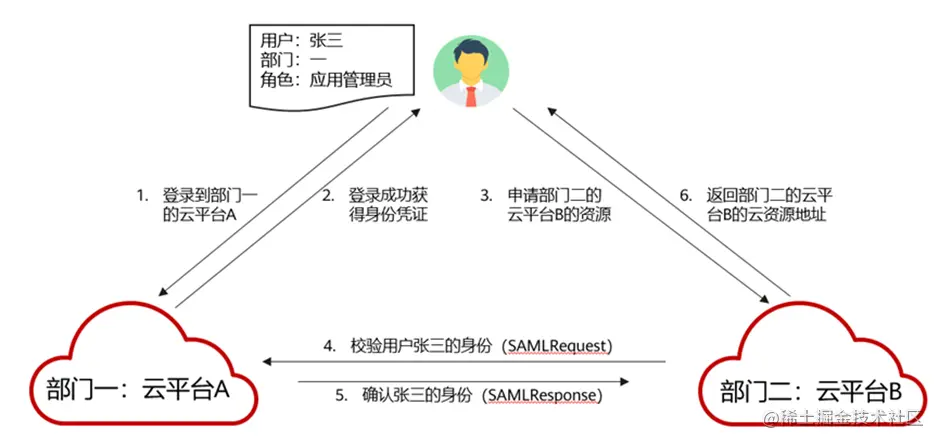 如上图所示,部门一的云平台用户张三,登录本部门的云平台A,再访问部门二的云平台B,如果云平台A与B之间建立了联邦认证,那么张三就可以无需二次登录到云平台B就可以访问云平台B的云服务和资源。