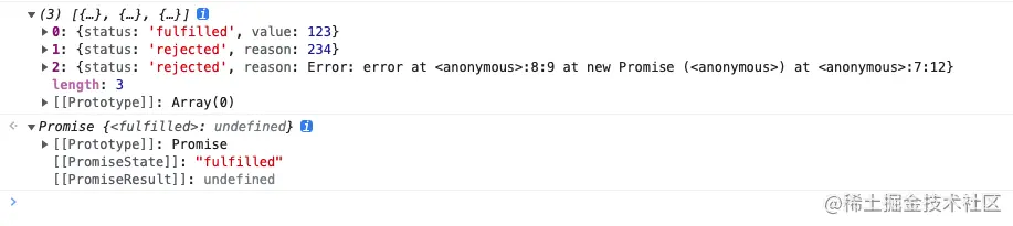 这个方法也是返回promise实例对象,数组内全部promise对象状态变化后,then回调函数接收返回结果,是一个数组里面映射每个成员的变化状态和结果