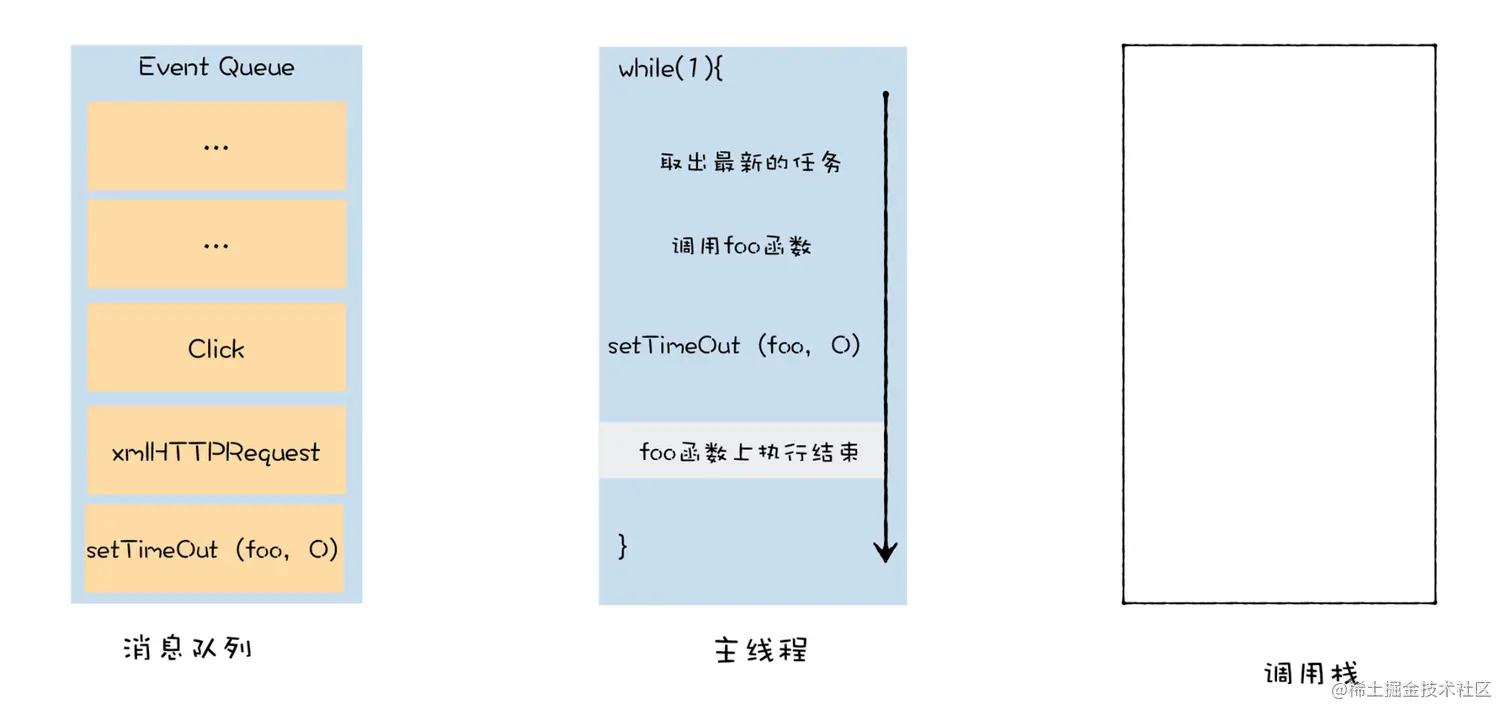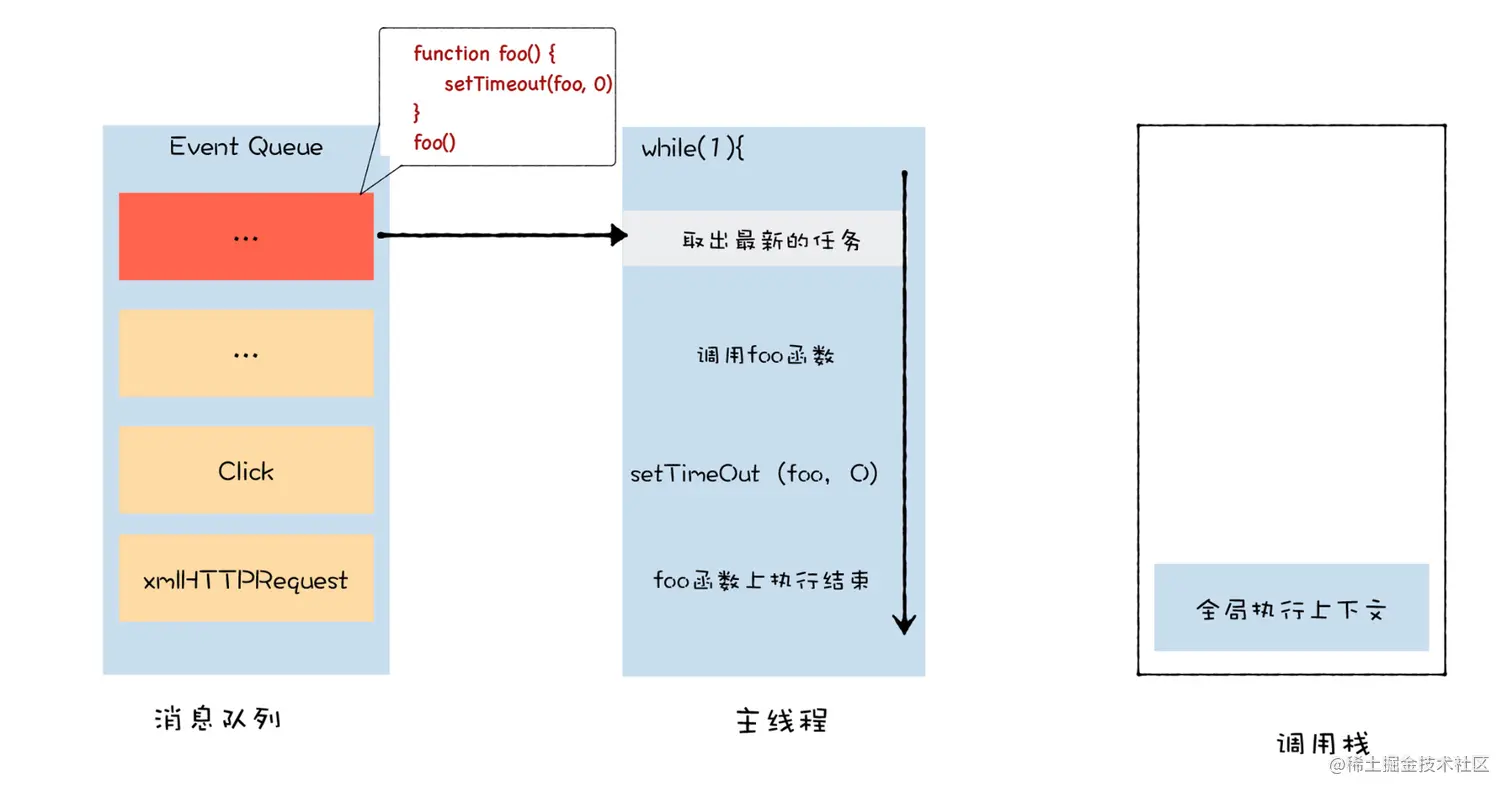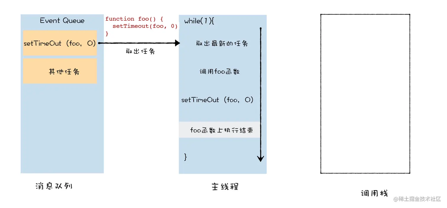 foo 函数并不是在当前的父函数内部被执行的,而是封装成了宏任务,并丢进了消息队列中,等待主线程从消息队列中取出该任务,再执行该回调函数 foo。