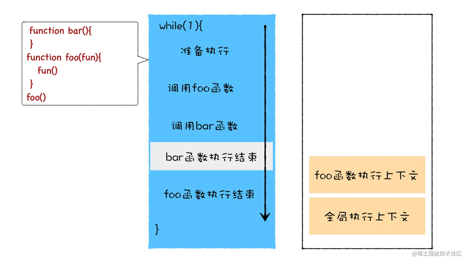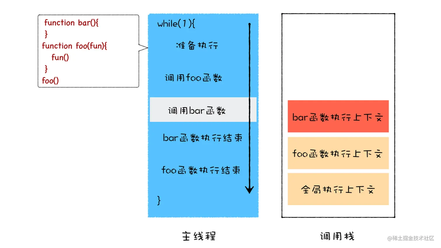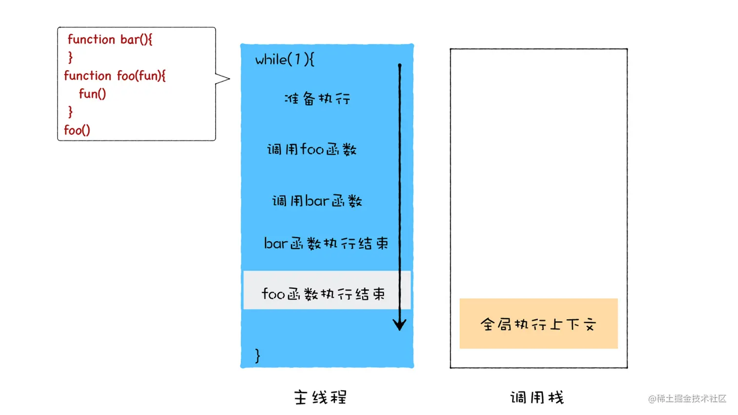 foo 函数并不是在当前的父函数内部被执行的,而是封装成了宏任务,并丢进了消息队列中,等待主线程从消息队列中取出该任务,再执行该回调函数 foo。