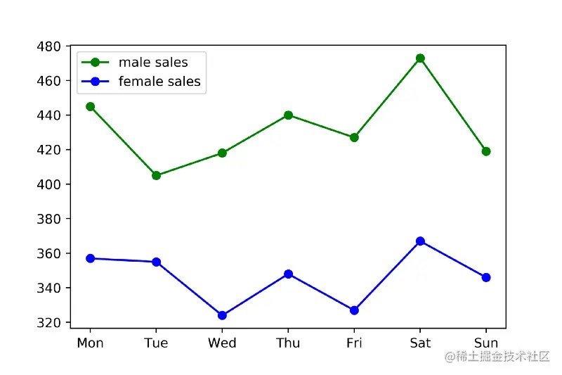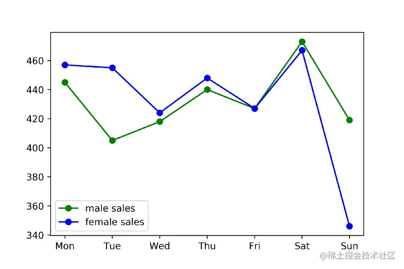 从这张图中可以看到在某个周日,男性用户购买了400多件产品,女性用户购买了350件产品。