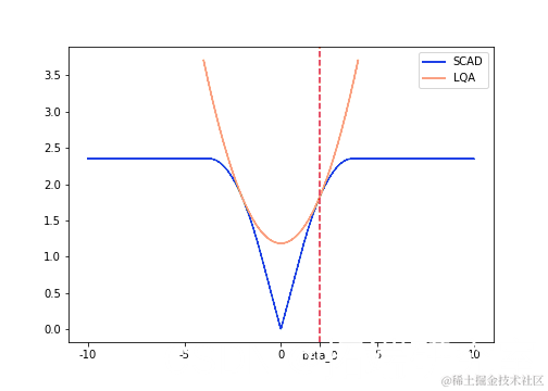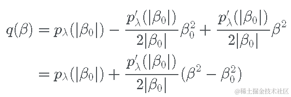 拟合惩罚最小二乘模型(包括 SCAD 惩罚模型)的一种通用方法是使用局部二次近似。这种方法相当于在初始点 β0 周围拟合二次函数 q(β),使得近似: