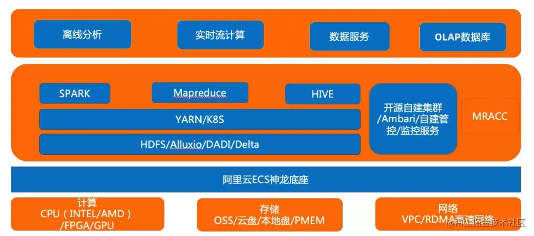 在数据处理需求激增的今天,许多企业会使用开源Spark、Hadoop组件或HDP、CDH等常用套件,自建开源大数据集群,处理数据量从TB到PB级,集群规模从几台到几千台。MRACC神龙大数据加速引擎,针对客户自建场景,依托神龙底座,提供常用组件加速能力,如Spark、Hadoop、Alluxio等。