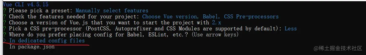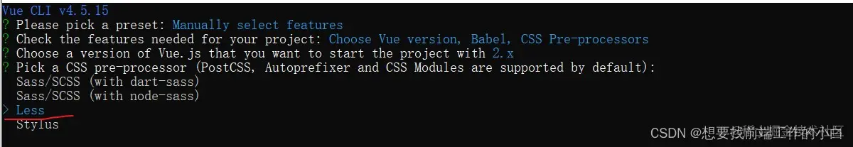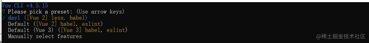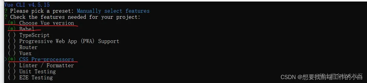 上面有三个选项,选择vue2.x版本、vue3.x版本以及自定义,对于新手来说一般选择最后一个Manually select features