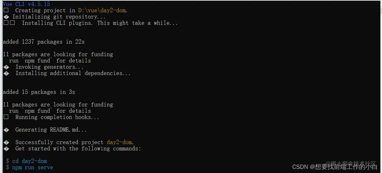 cd day2-dom是你创建的项目,现在需要进入该文件中,所以先在终端上输入该指令