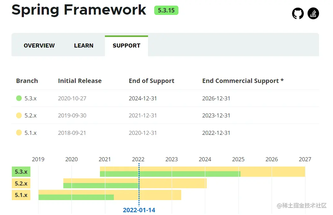 目前 Spring 支持的主流版本是 5.3,开源支持的时间最迟到 2025 年。
