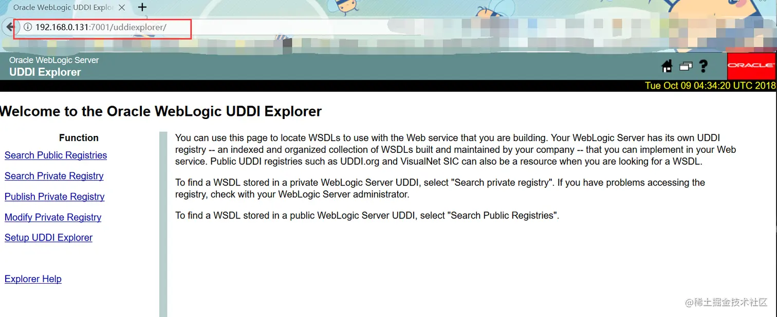 搭建过程不在详述,搭建完成后,访问 http://your-ip:7001/uddiexplorer/ 无需登录即可查看uddiexplorer应用。