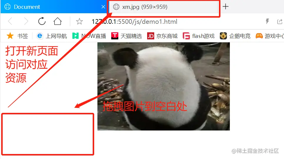 draggable = true时拖拽图片,鼠标下会有图片缩影,放开鼠标后,浏览器会打开新页面并访问对应资源的url地址 -