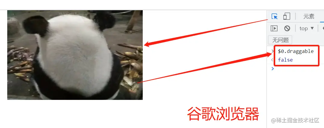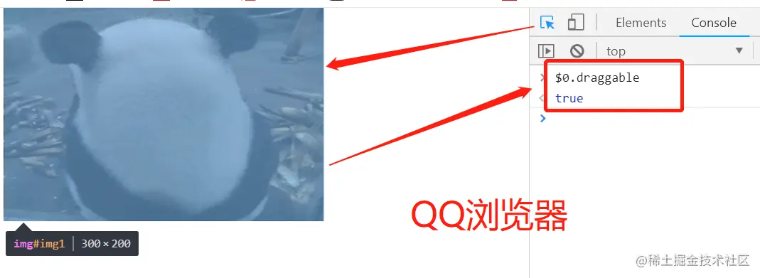 如上图所示,在不同浏览器下,对于图片、链接等元素的 draggable 属性的默认值是不同的,这就导致了它们在浏览器上进行拖拽后产生了差异,下面就以 谷歌浏览器 和 QQ 浏览器进行对比: