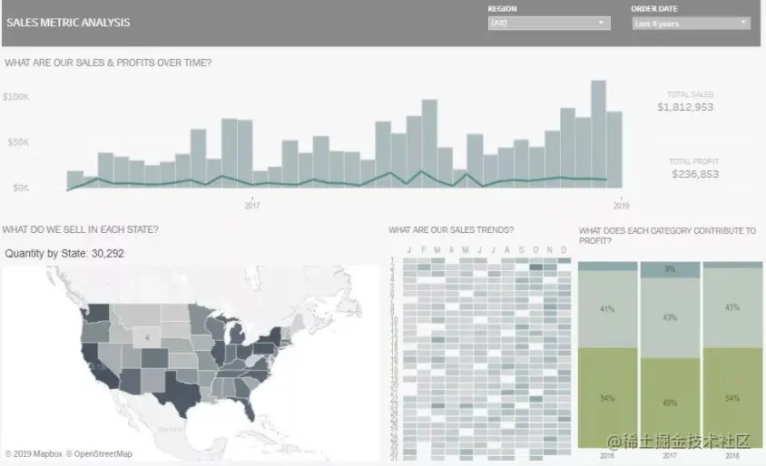 通过颜色的深浅来表达指标值的强弱和大小,是数据可视化设计的常用方法,用户一眼看上去便可整体的看出哪一部分指标的数据值更突出。