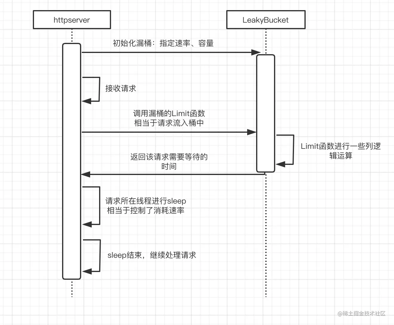 当新请求流入后,发现桶已经满了,就不再排队了,而是直接被丢弃掉。那如何计算桶是否已经满了呢?其实就是根据当前时间now,和桶中排队的最后一个请求被处理的时间last之间的差值,再除以速率rate,就能计算出正在等待被处理的请求有多少个了,然后和capacity进行比较即可: