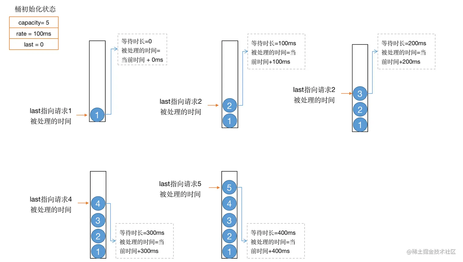 假设现在LeakyBucket是一个空桶,按100ms处理一个请求的速率漏出,容量大小为5。现在同时有5个请求流入桶中,我们看看每个请求经过Limit是如何计算各自的预计处理时间以及等待时间的。