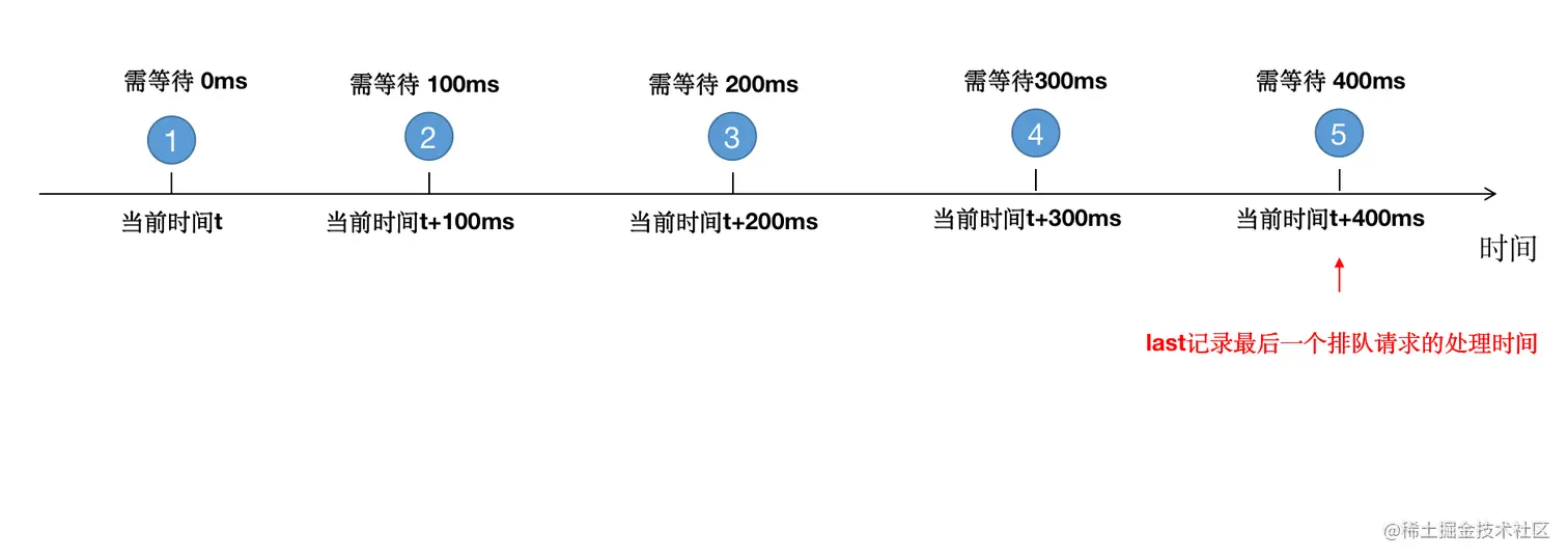 - 第二个请求,因为第一个请求刚刚排队并被处理了,那么就需要按处理速率等待,那么被处理的时间就是第一个请求被处理的时间+rate,即last=t+100ms