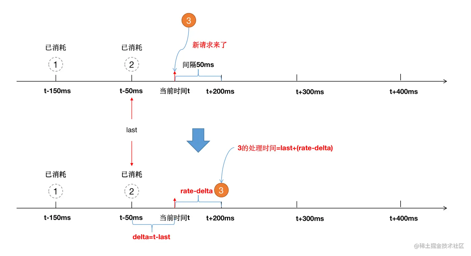 这样计算的话就比rate多了50ms。那该如何计算呢? 实际的被处理时间应该是先计算当前时间距离上次被处理时间的间隔,然后再跟rate进行比较,看看比rate差多少,然后补全该差值即可,即: