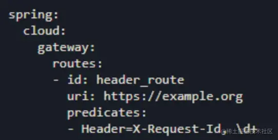 Header Route Predicate Factory 包括两个参数包括头名称和值的正则表达式。此断言匹配一个头信息包括该名称和符合该正则表达式值得请求。