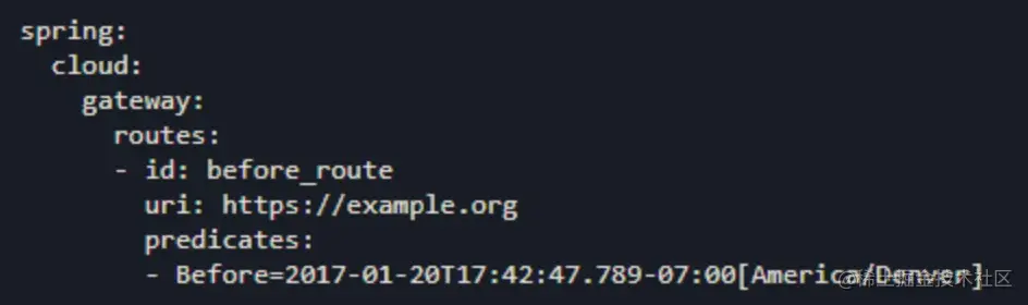Before Route Predicate Factory 有一个时间参数,此断言匹配发生在该时间参数之前的请求。
