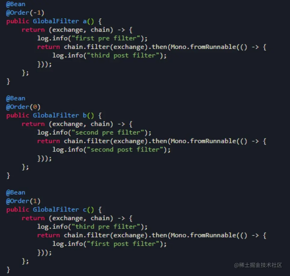 Global Filter接口与GatewayFilter具有相同的签名。这些是有条件地应用于所有路由的特殊过滤器。