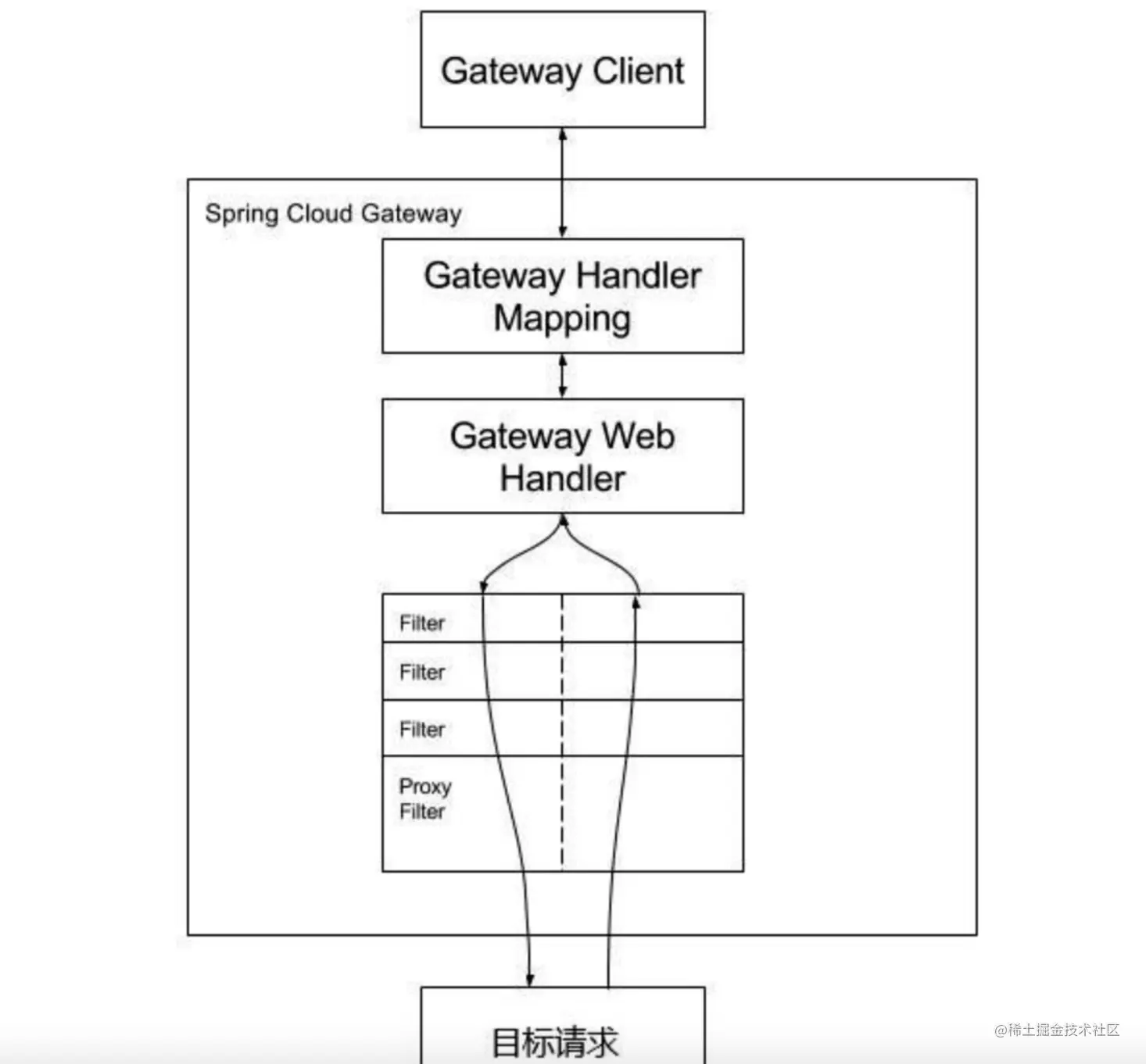 GatewayClient请求 Spring Cloud Gateway,如果Gateway Handler Mapping 确定请求与路由匹配,该请求被发送到Gateway Web Handler。此Handler运行时发送请求到具体的请求,其中通过过滤器链。