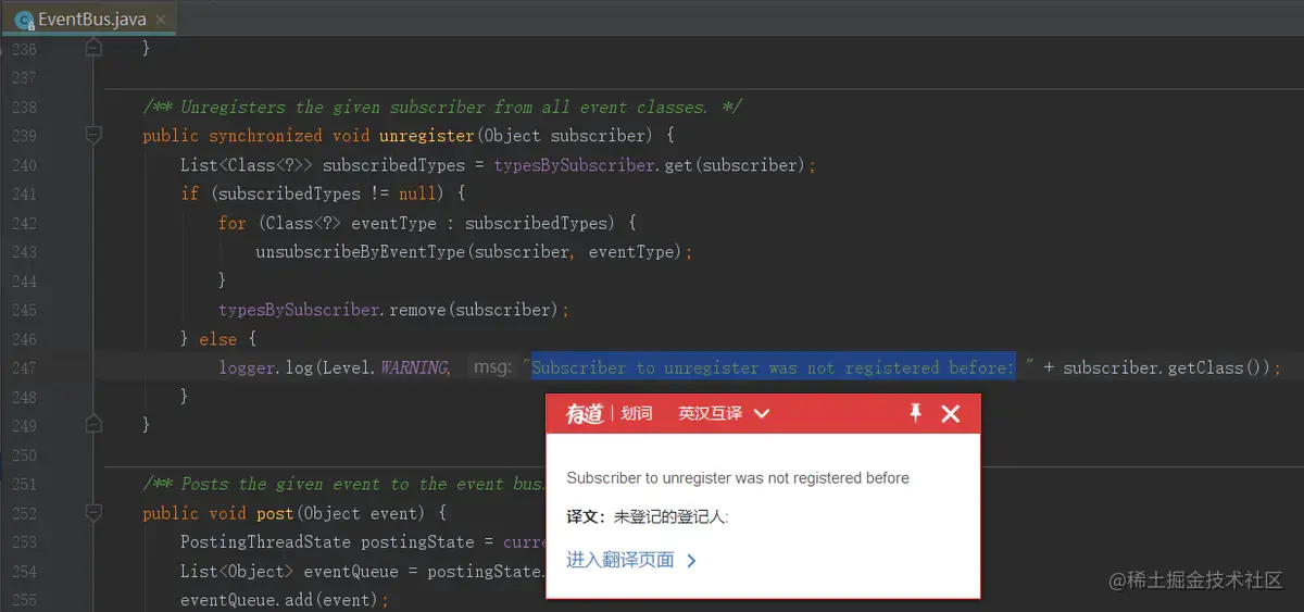 然而并不会抛异常,只是简单地打印了一个 log 日志,所以在 EventBus.unregister 方法中无需捕捉异常