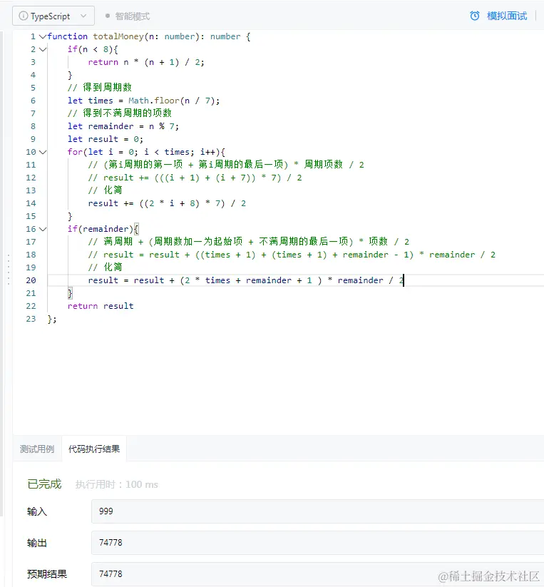 计算力扣银行的钱 陈理性呀 2022-01-15 118 阅读1分钟 计算力扣银行的钱:难度简单 思路:其实就是一个个等差为1数列,起始项也是每个周期等差为1。 当天数小于等于7天时,就只有一个周期,公式:n * (1 + n ) / 2。除以2是因为计算了两次,一次 1+2+ 3+.....+n,一次 n + (n-1) + ...... + 1; 当余数不满一个周期时,需要记录前一个周期是第几个周期,然后这个周期的起始项就是第n个周期加一,然后再计算出最后一项。具体方式如下图 运行结果: