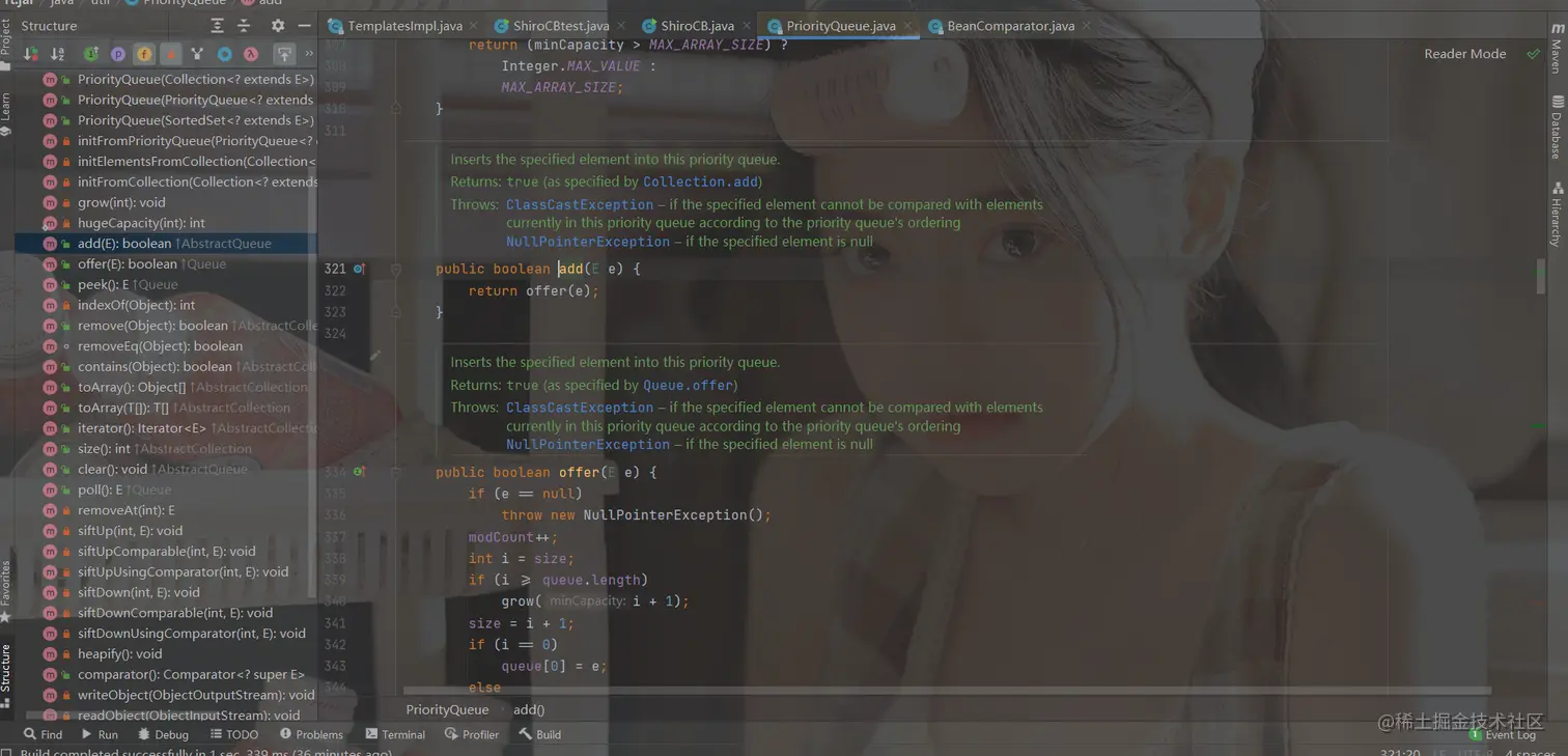 到这里,我们可以看到siftDownUsingComparator方法最终执行了comparator.compare,且comparator我们可以直接反射成BeanComparator。接下来我们只需要将queue添加TemplatesImpl类就可以了。我们看一下add方法。