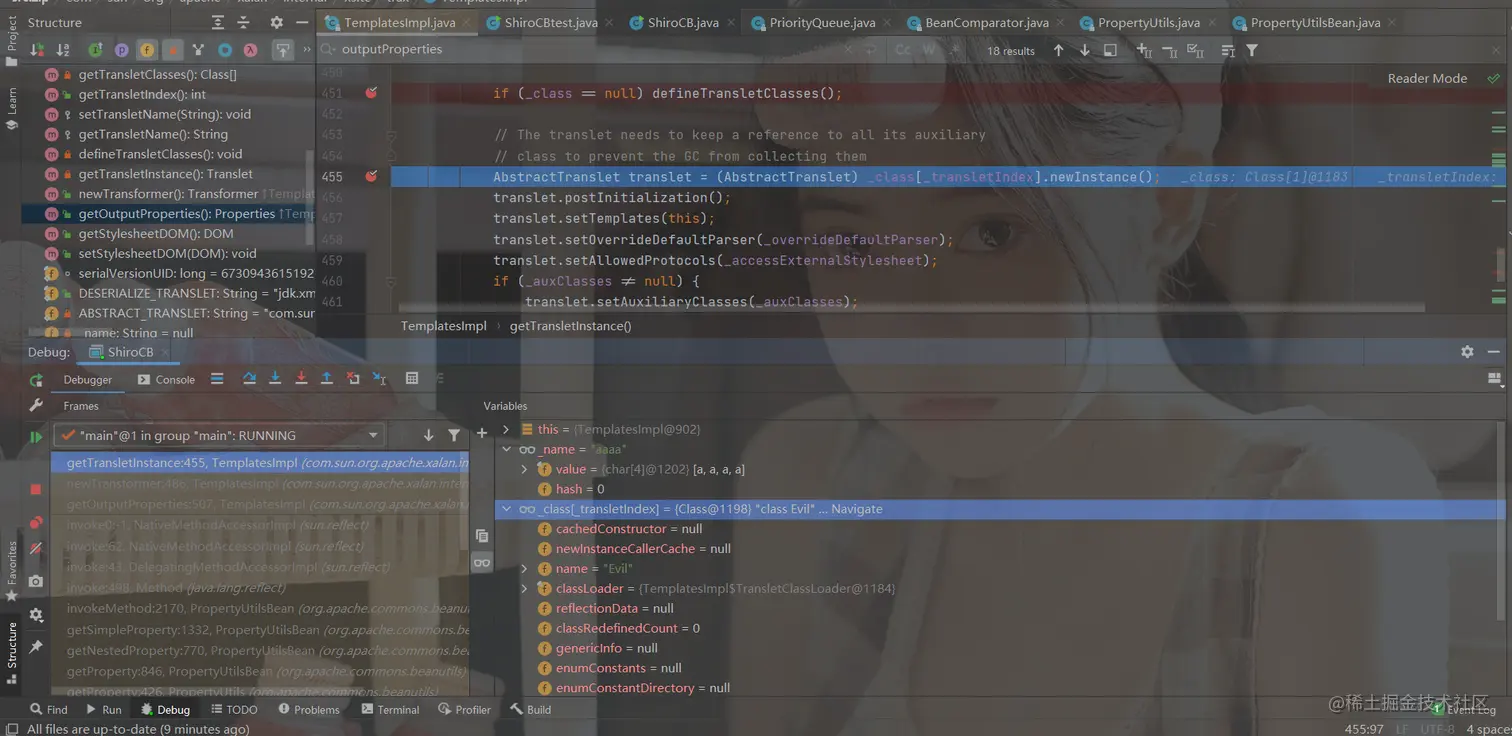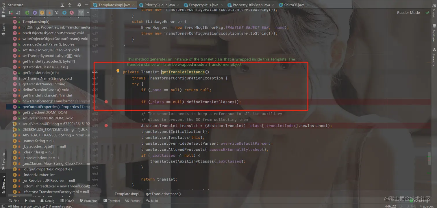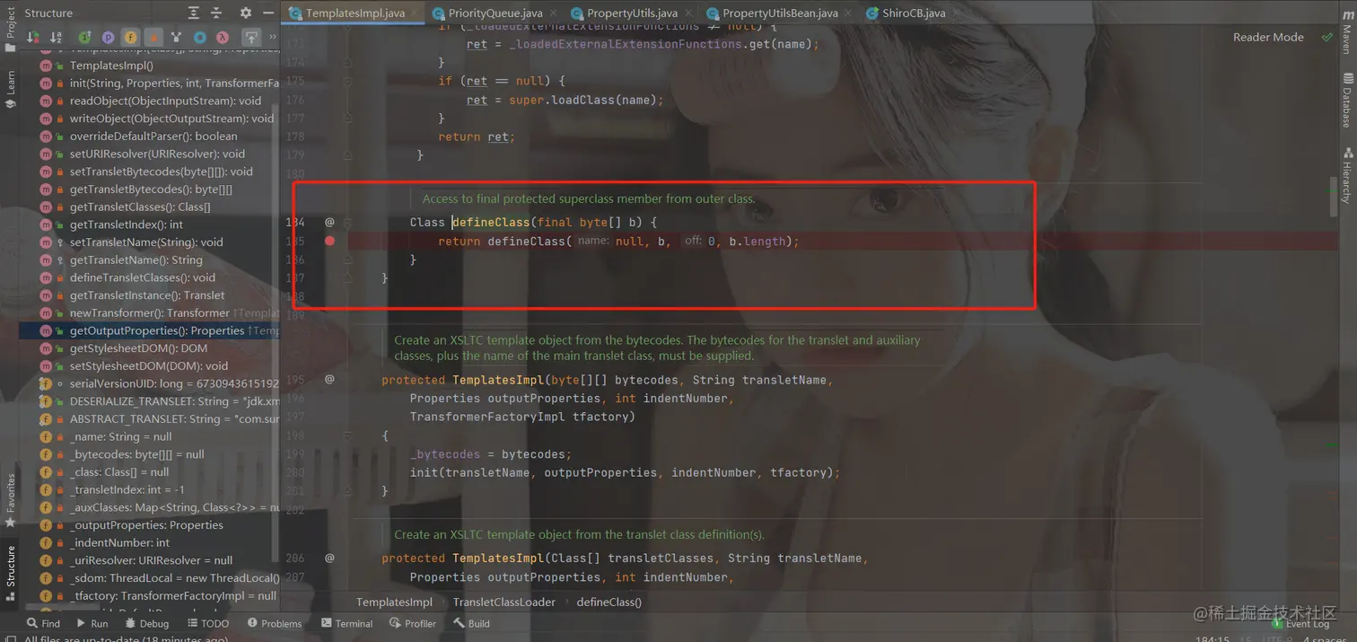 跳转到getOutputProperties方法,一路往下走,最终还原class,实例化恶意类。