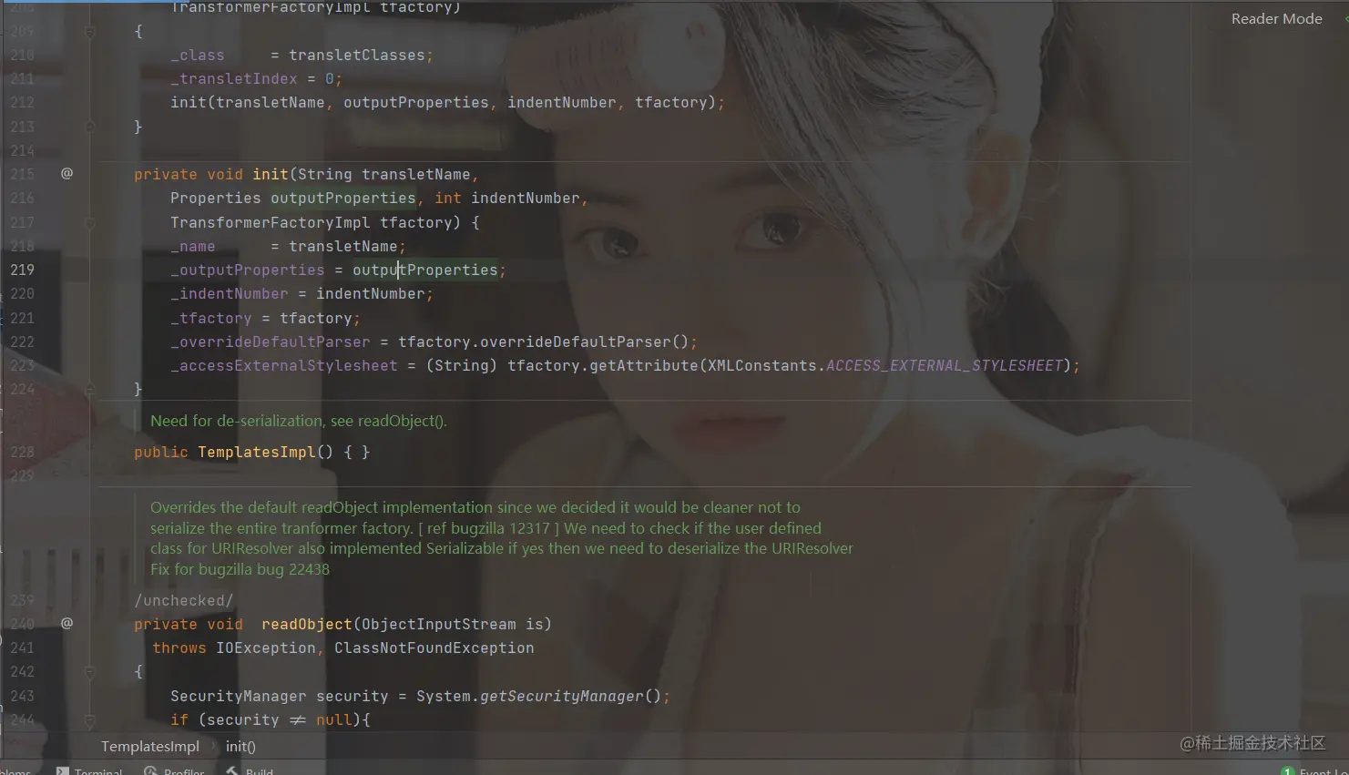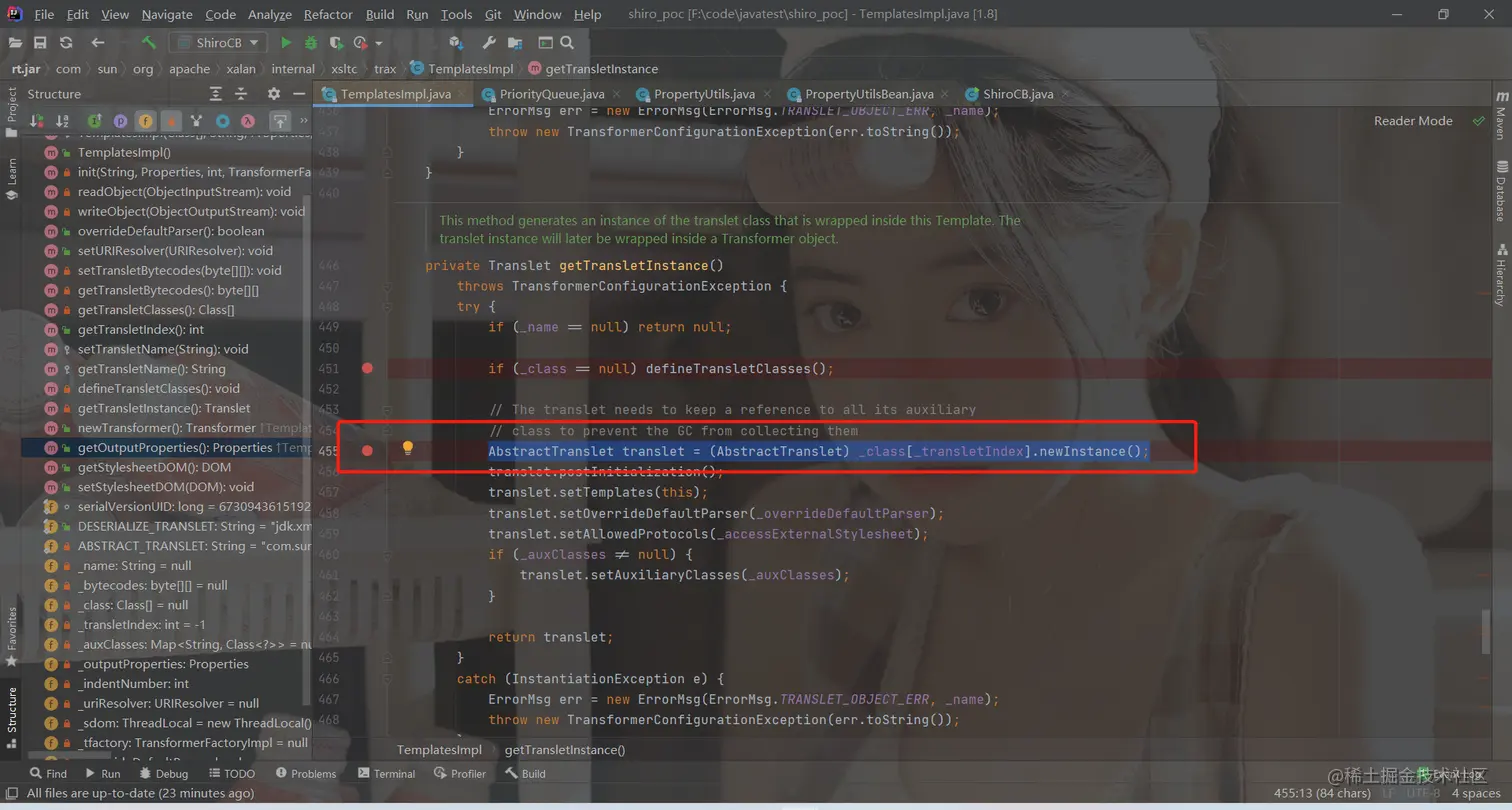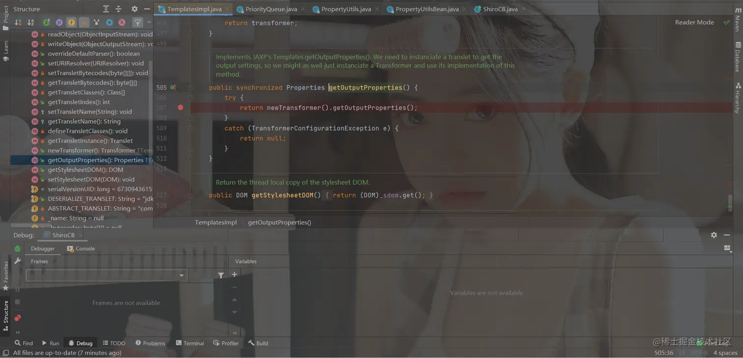 跳转到getOutputProperties方法,一路往下走,最终还原class,实例化恶意类。