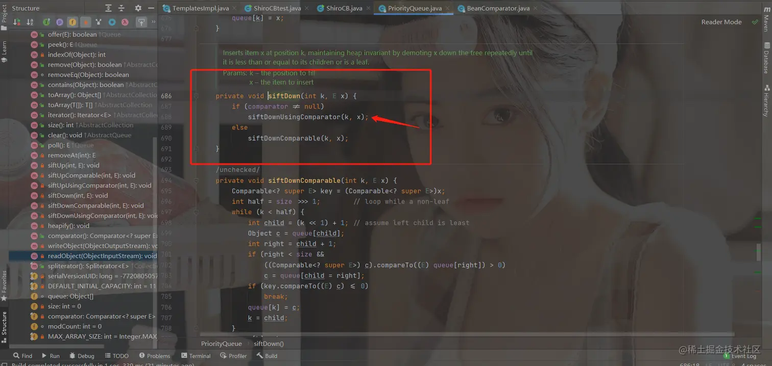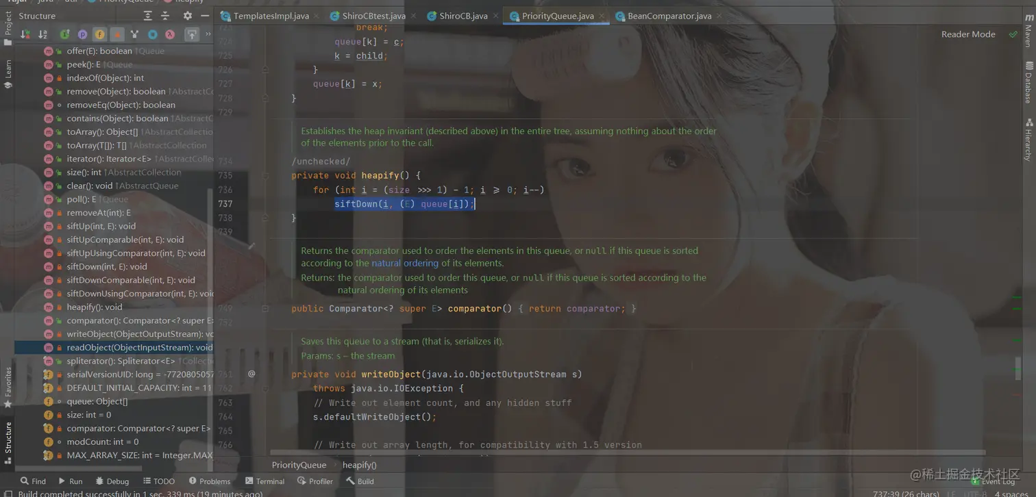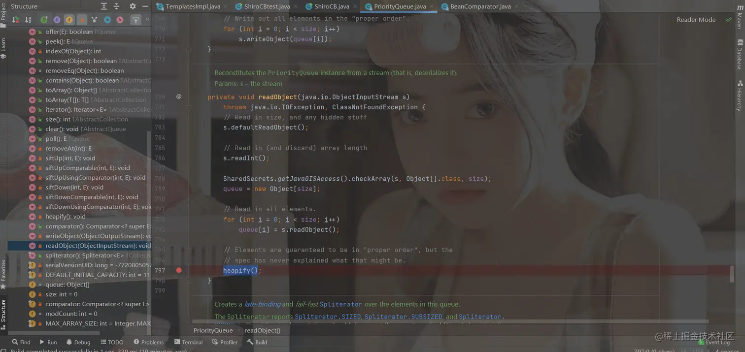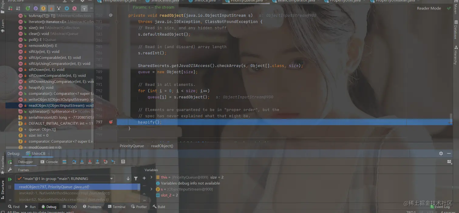 首先执行反序列化执行PriorityQueue类的readObject(),进入heapify